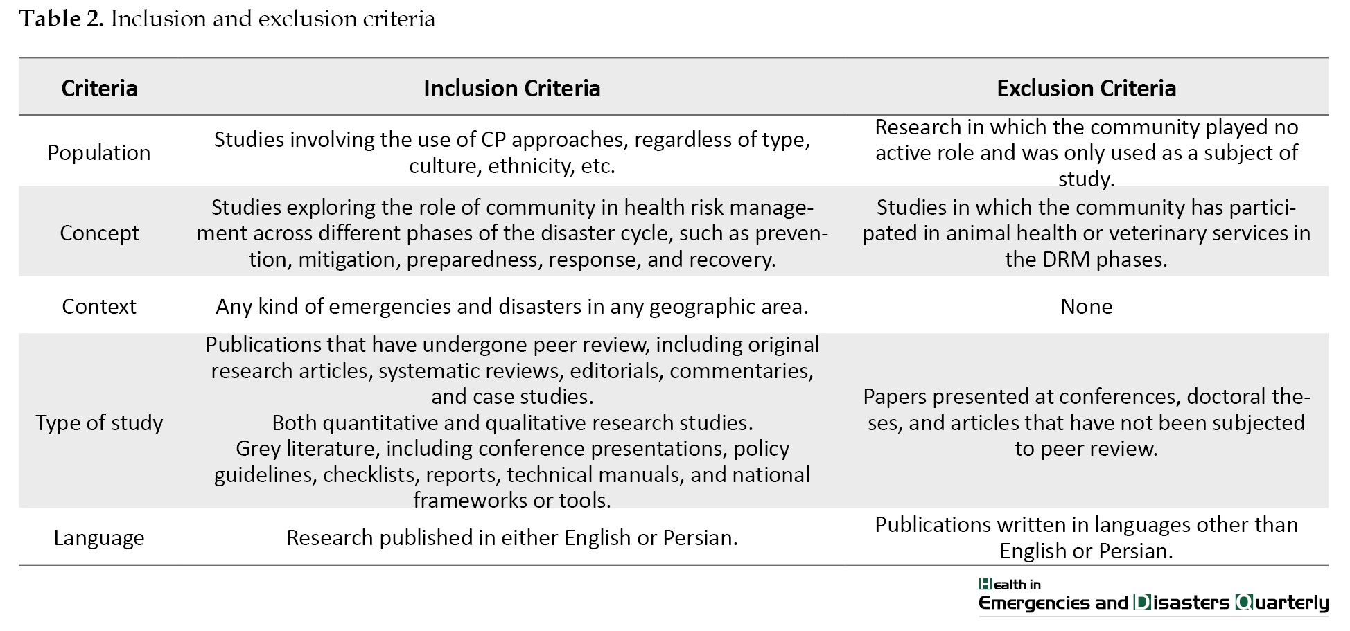 The main goal of this review was to offer a thorough summary of the current research on CP approaches in Health EDRM. In doing so, we sought to identify the critical factors, components, and indicators that impact CP, while also addressing gaps in the literature, emerging trends, and effective practices. The results will assist policymakers, practitioners, and stakeholders in strengthening community-driven strategies for managing health in disaster situations. Given the exploratory nature of the research questions, a scoping review methodology will be utilized to examine these topics and clarify key concepts.