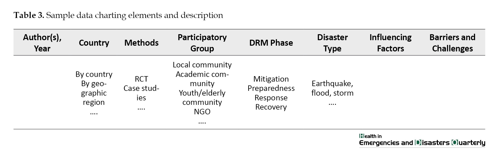 Table 3 presents an initial charting table containing the data elements relevant to addressing the research questions.