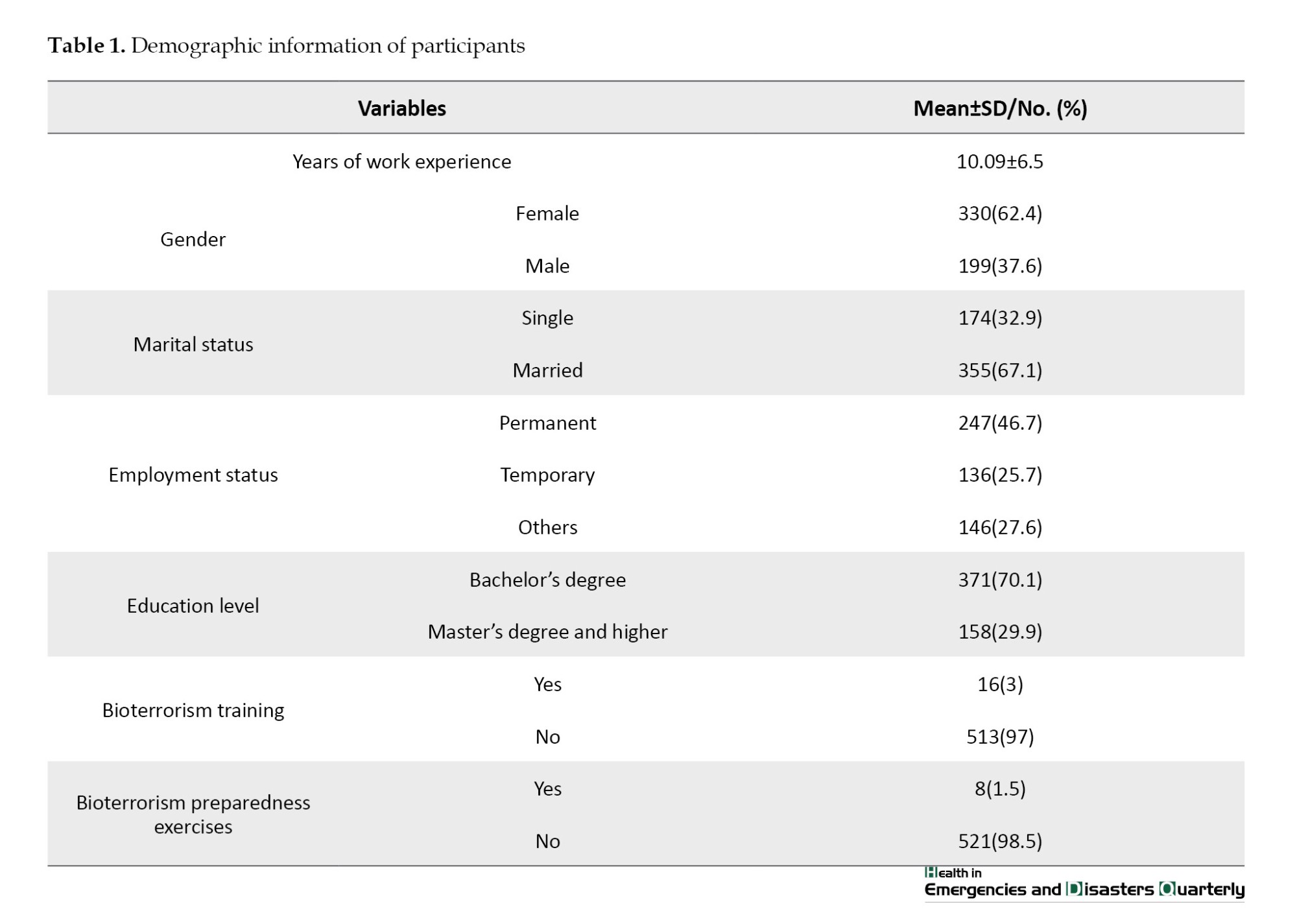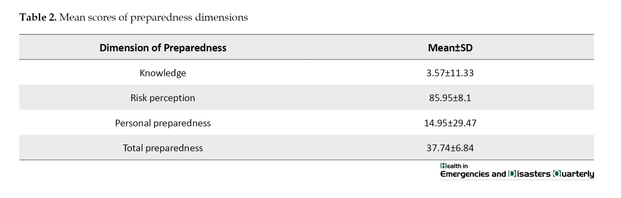 31]. The study participants’ knowledge, skills, and individual preparedness were average. The results of regression analysis showed that six variables had a statistically significant relationship with preparedness: Disaster and bioterrorism training, disaster experience, education level, work experience, and experience of participating in global health missions. The relationship between education level and preparedness was inverse [