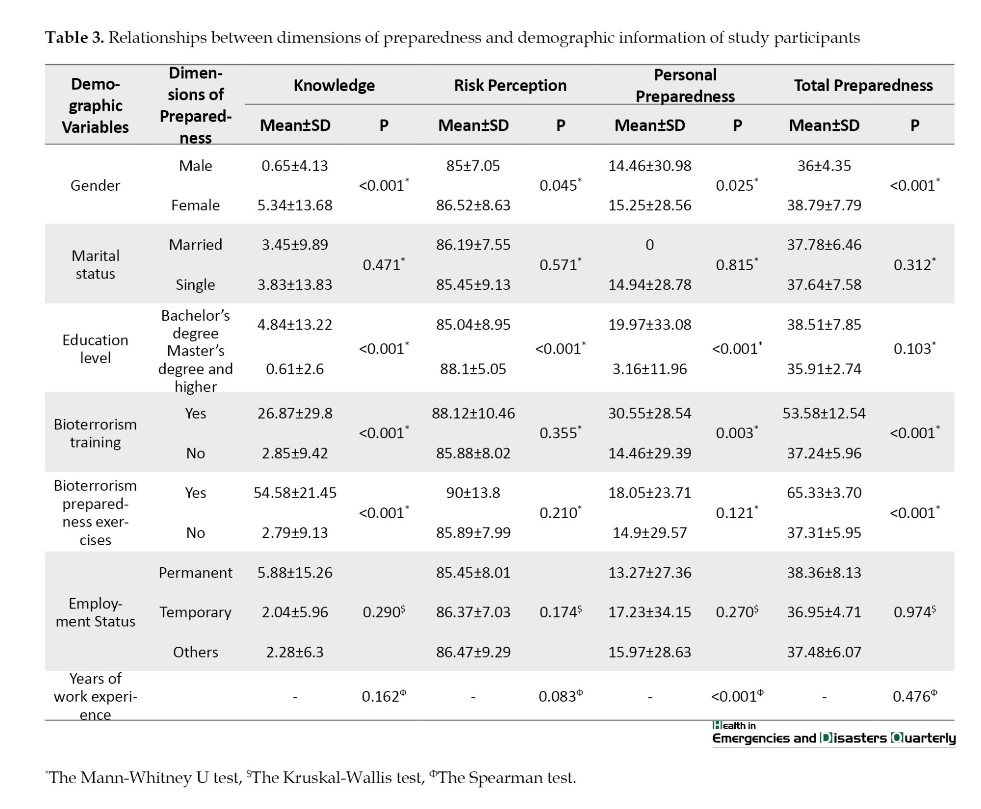 Table 3, there was a statistically significant relationship between gender and all dimensions of preparedness against bioterrorism attacks. Women were more prepared than men in all dimensions (P<0.05). The results showed a statistically significant relationship between the level of education and preparedness in terms of knowledge, risk perception, and personal preparedness (P<0.001). Study participants with a bachelor’s degree obtained higher scores on knowledge, risk perception and personal preparedness than those with a master’s degree or higher.