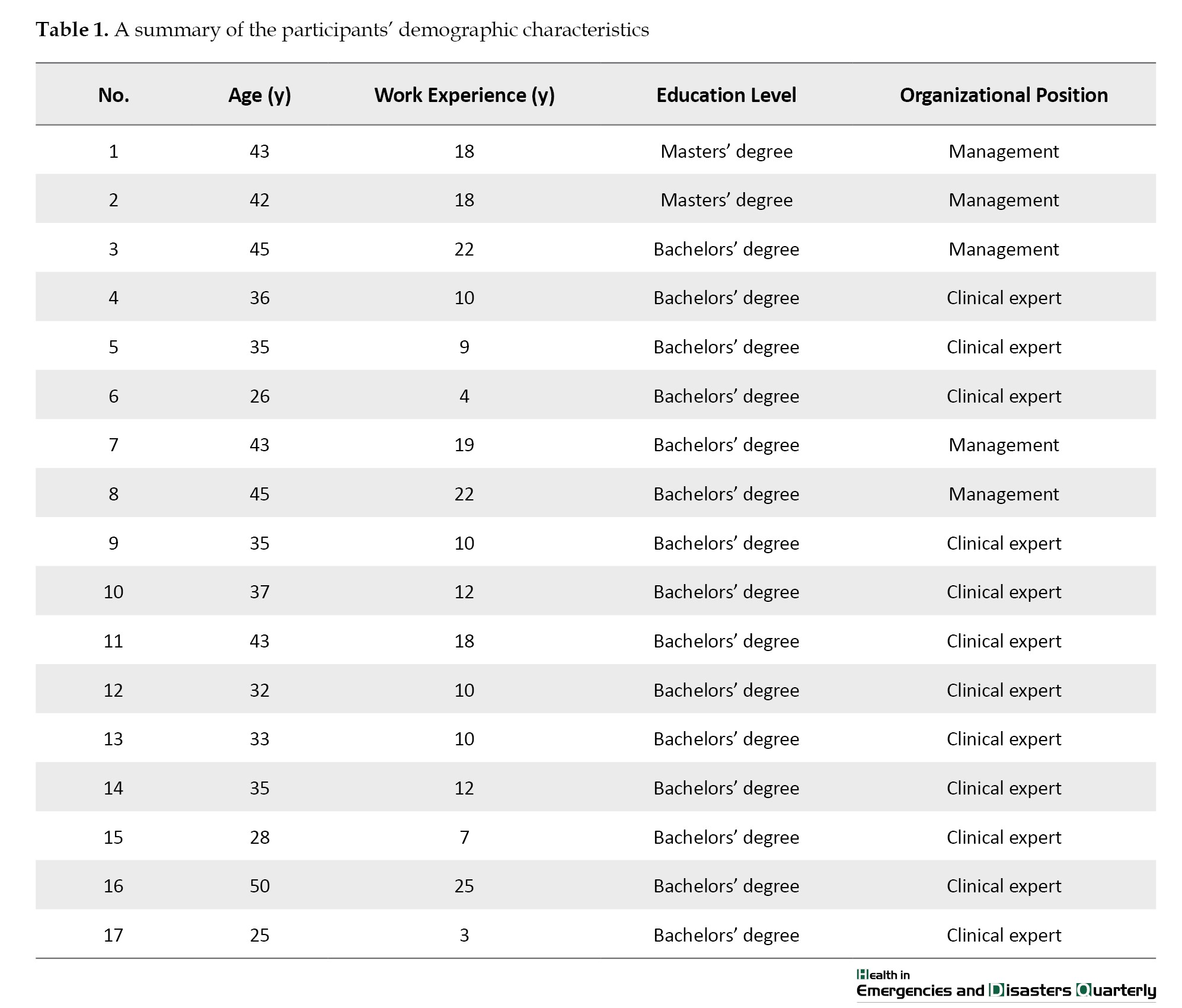 The interviews with the participants were conducted over 5 months. Seventeen individual and face-to-face interviews were held with 17 participants. The interviews continued until data saturation was reached, with no new data or categories emerging. Data saturation occurred after the 15th interview. Two more interviews were conducted to ensure data saturation. The mean duration of each interview was 20 minutes. To manage the data, MAXQDA software, version 10 was used. The characteristics of the participants are shown in
