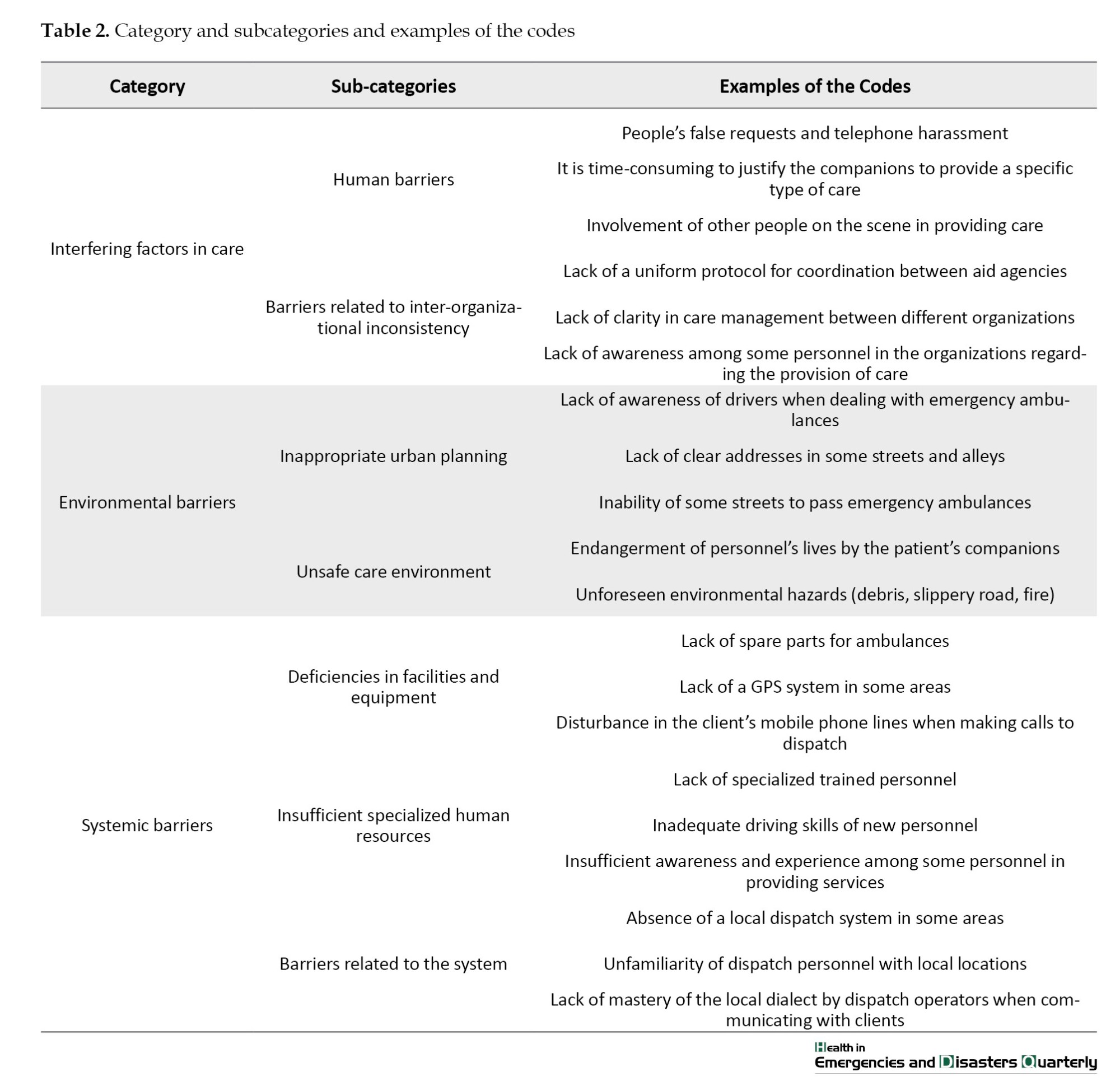 The study yielded three categories (barriers to care, systemic barriers, and environmental barriers) and 17 subcategories (human barriers, barriers related to inter-organizational inconsistency, inappropriate urban planning, unsafe care environment, deficiencies in facilities and equipment, insufficient specialized human resources, and barriers related to the system). The categories and subcategories of the study are shown in